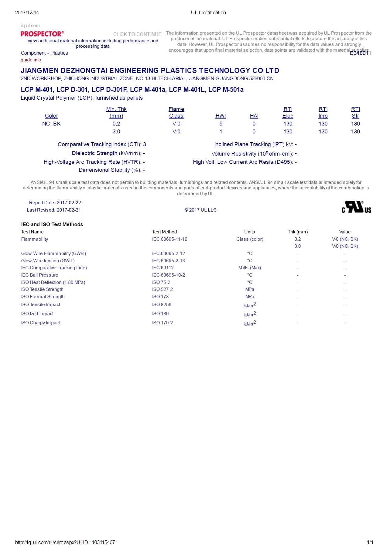 分子鏈由大量芳環(huán)構(gòu)成,火焰中由于表面形成一層泡沸炭而窒息火焰,因此不加阻燃劑, LCP也具有自熄性,極限氧指數(shù)約35%,阻燃性可達(dá)UL94 V-0級(jí)水平。德眾泰LCP產(chǎn)品最薄可以成型0.2 mm厚度的薄壁制品,并通過了UL94 V-0認(rèn)證。